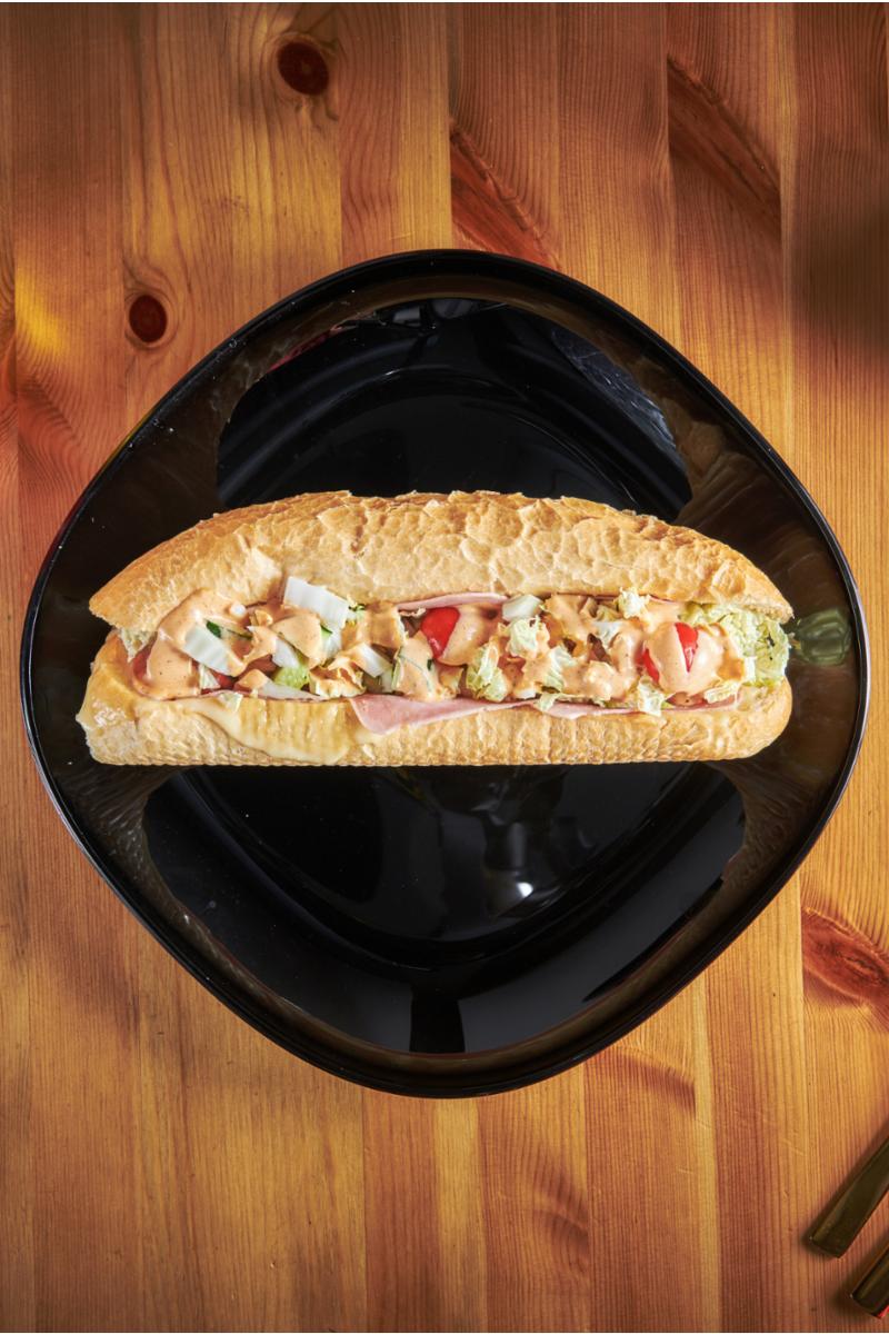 Landgang medost. skinke, salat og dressing. Allergen:Egg, sennep, hvete og melk