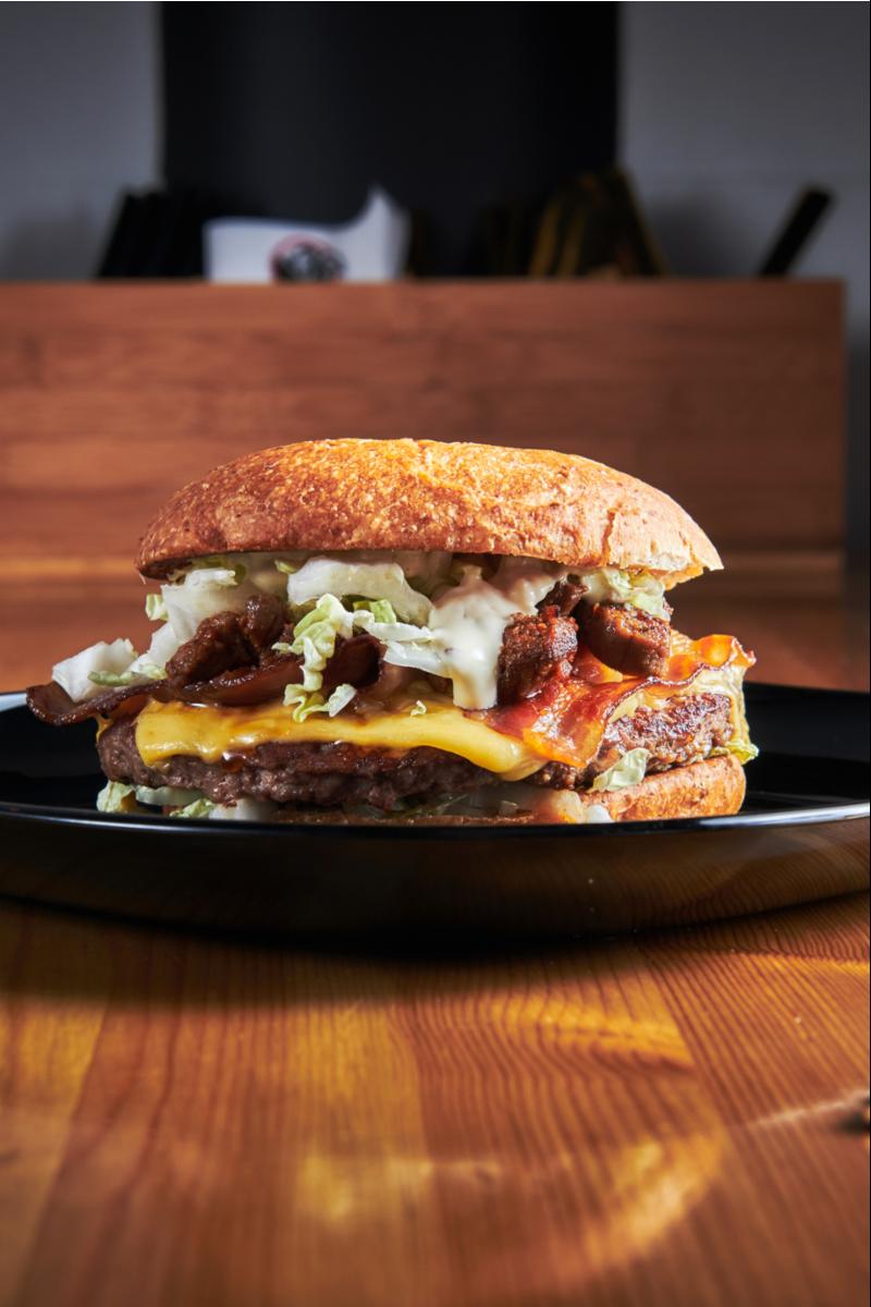 Biffkjøtt, ost, bacon, salat, hjemmelaget hvitløkdressing, løk og sylteagurk. Allergen:Egg, sennep, hvete, havre og sulfitter