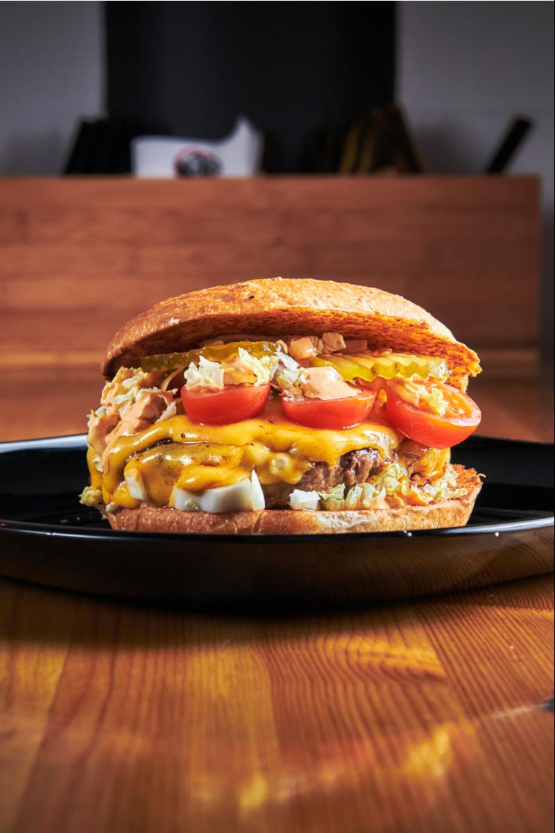 Cheddar, salat, dressing, tomat og sylteagurk. Allergen:Egg, sennep, hvete, havre og melk