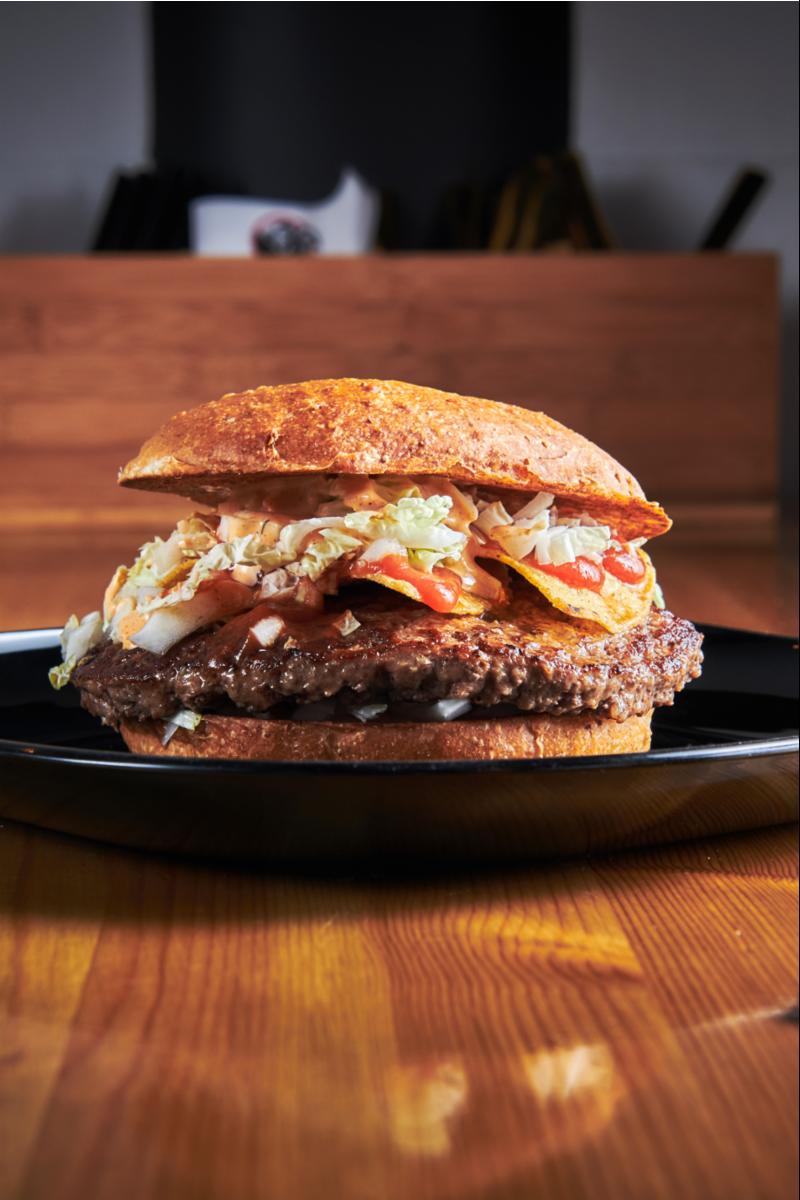 Bacon, kryddersmør, salat, dressing, løk og sylteagurk. Allergen:Egg, sennep, hvete, havre, melk, soya og sulfitter