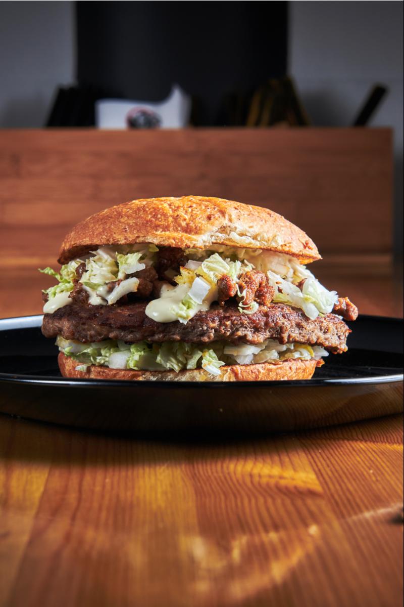 Biffkjøtt, salat, hjemmelaget hvitløkdressing, løk og sylteagurk. Allergen:Egg, sennep, hvete, havre og sulfitter