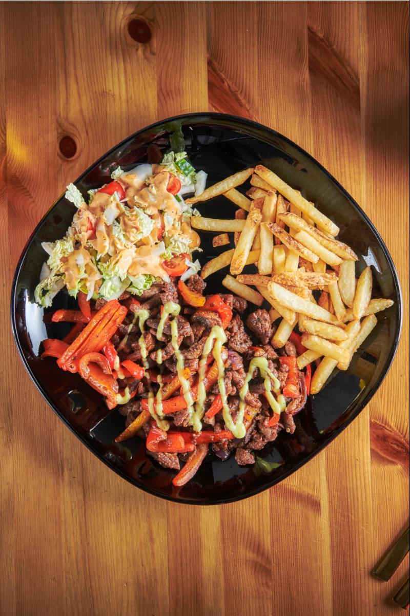 Biffkjøtt, sopp, løk og paprika, bearnaise, fries, salat og hjemmelaget dressing. Allergen:Melk, egg, sennep og soya
