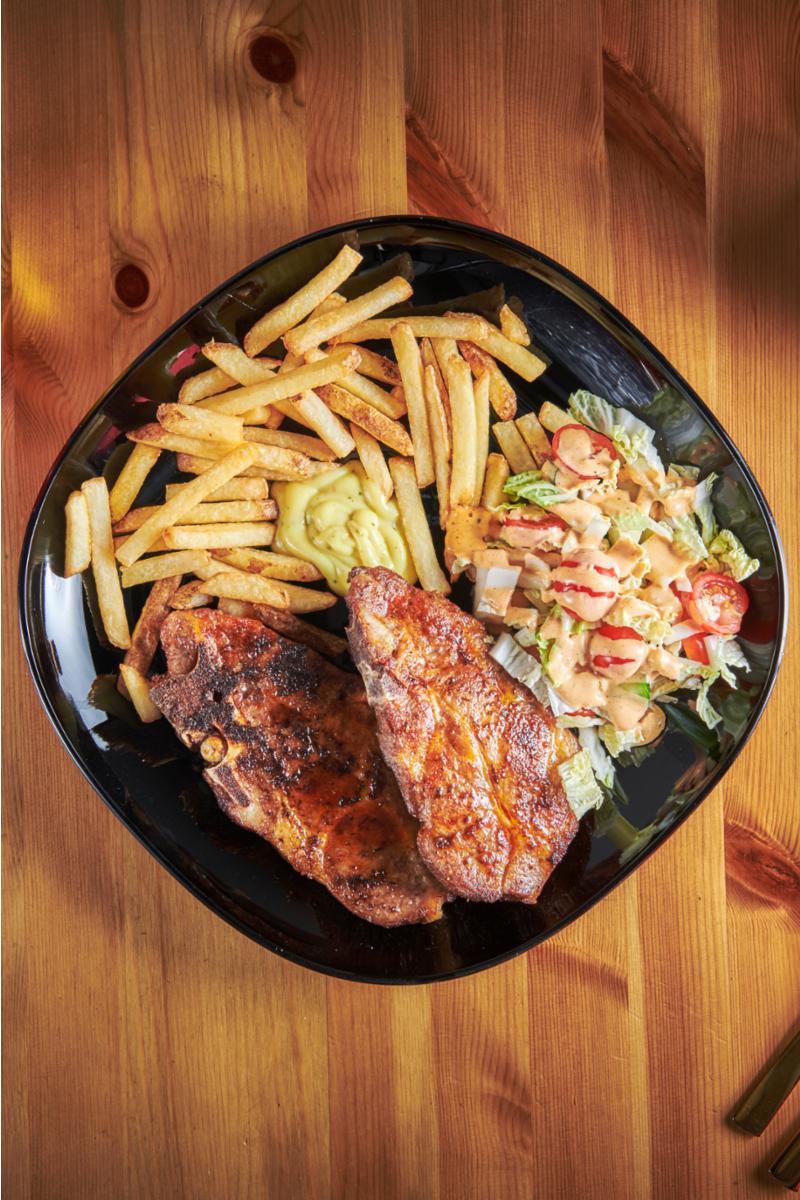 Nakkekotelett, fries, salat, hjemmelaget dressing og bearnaisesaus. Allergen:Melk, egg, sennep og soya